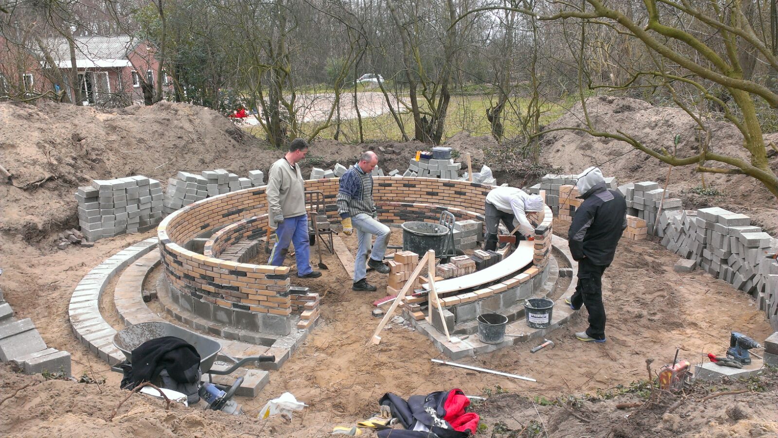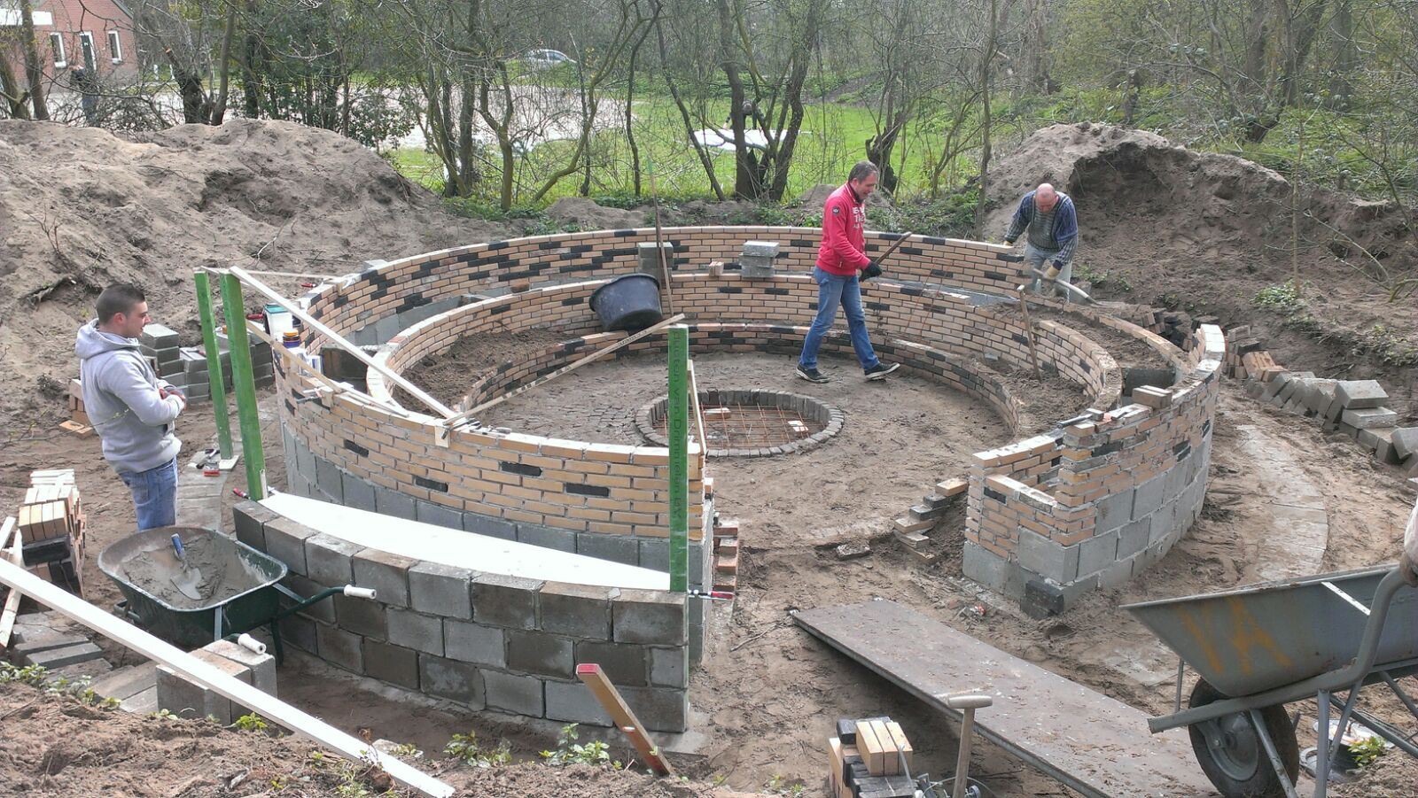 Na het graven van de kuil hebben op de NL-Doedag vele ouders mee geholpen het bouwmateriaal op de plaats van bestemming te krijgen. De zaterdagen daarna zijn besteed aan het zorgvuldig opmetselen van de muurtjes. Afgelopen zaterdag 23 april 2016 hebben een groot aantal ouders meegeholpen met vele vele en nog meer kruiwagens zand de zitringen te vullen. Resteert nog het voegen en het aanbrengen van stenen om op te zitten. Eind mei staat de opening op het programma…..