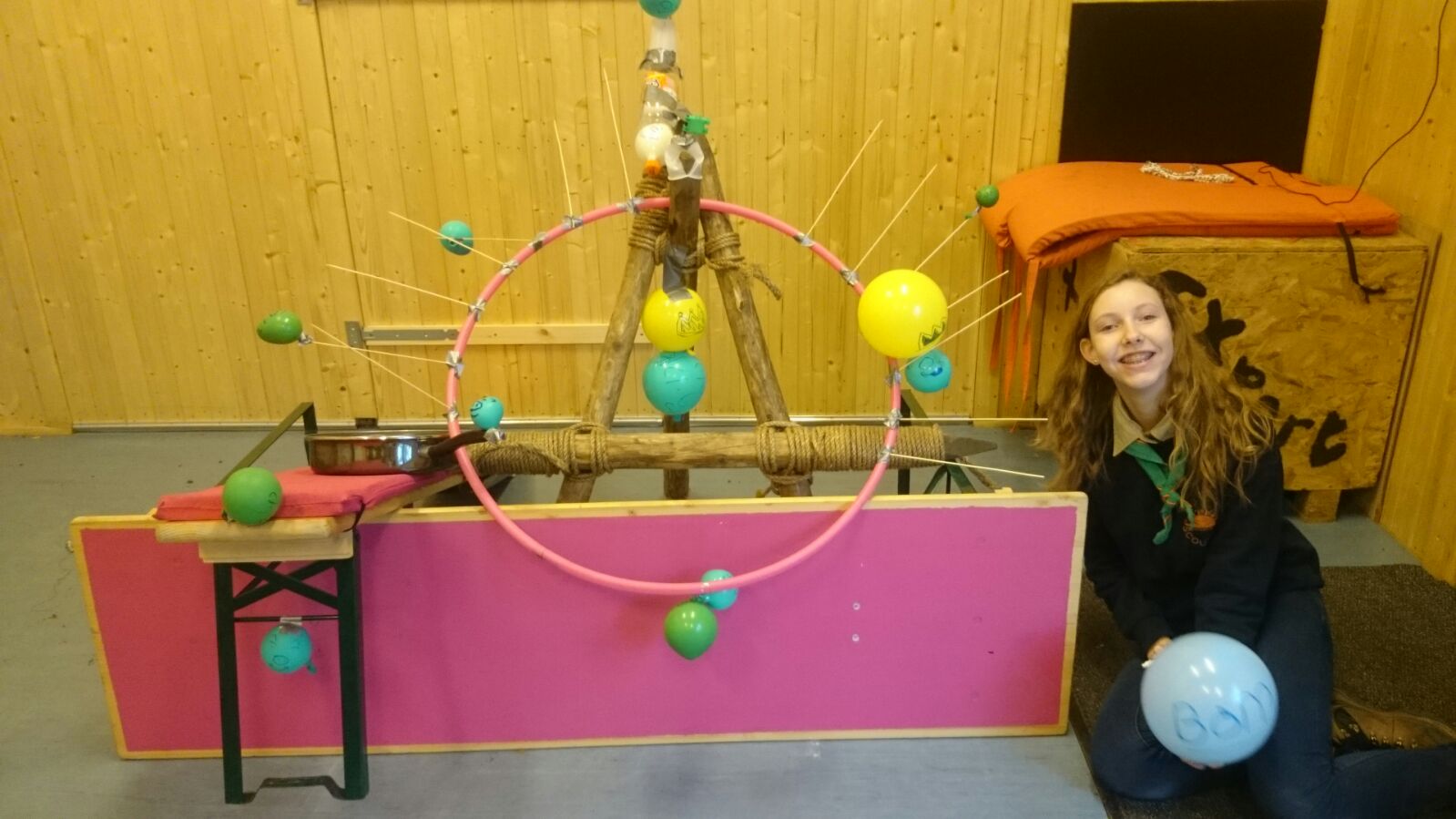Verder hebben de patrouilles afzonderlijk een stoel van ballonnen gemaakt. Een kunst op zich natuurlijk om een ontwerp uit te denken dat onder dit gewicht niet bezwijkt. Bedoeling was dat alle patrouilleleden op “de stoel” konden “plaatsnemen”. Eenvoud en het verdelen van het gewicht waren het toverwoord.
