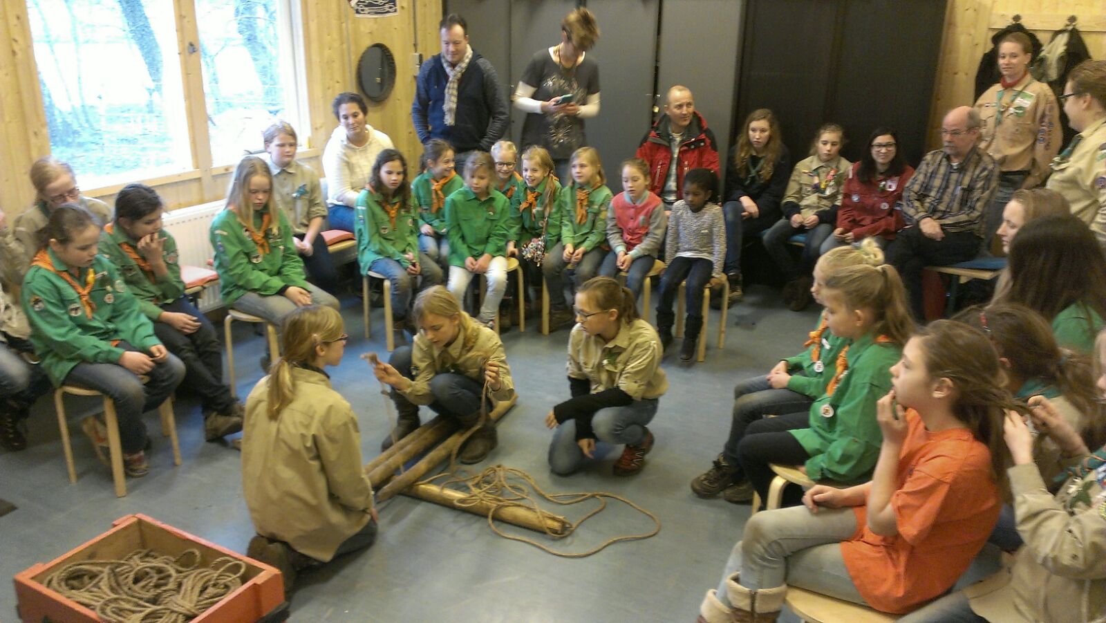 Tijdens de break konden de kids hun energie kwijt bij het Mc Donalds spel. Daarna waren Valerie, Dorien en Manuela aan de beurt om te worden geinstalleerd. Vooraf hadden de meiden laten zien de scouttechnieken onder de knie te hebben. De middag werd afgesloten met een heftig smokkelspel. Na de sluiting stind er voor de ouders koffie klaar met de traditionele cake natuurlijk….