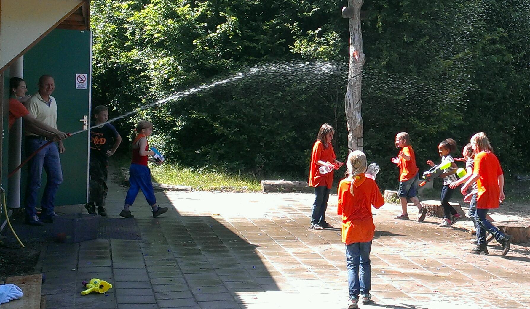 Na het officiele gedeelte konden de welpen helemaal los gaan met de waterspelletjes. Waterpistolen, balonnen, sponzen, bekers, emmers etc het was er allemaal natuurlijk. Ondanks het mooie weer waren de kids toch aardig afgekoeld mede door het koude water uit de brandslang. Nadat lekker gedouched was en droge kleren waren aangetrokken stond er nog drinken klaar. Na de sluiting is “meegeholpen” de cake op te eten die bij de koffiemiddag op tafel stond. Nadat de spullen waren opgeruimd was een eind gekomen aan de laatstemiddag voor het zomerkamp.